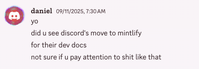 this started when i was notified that discord switched documentation platforms to mintlify, a company i briefly looked into before, and i thought it would be a good idea to take another look now that theyre bigger.